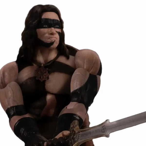 Action figure of a muscular character with a spear and sword on a white backgroundAction figure of a muscular character with accessories on a white background