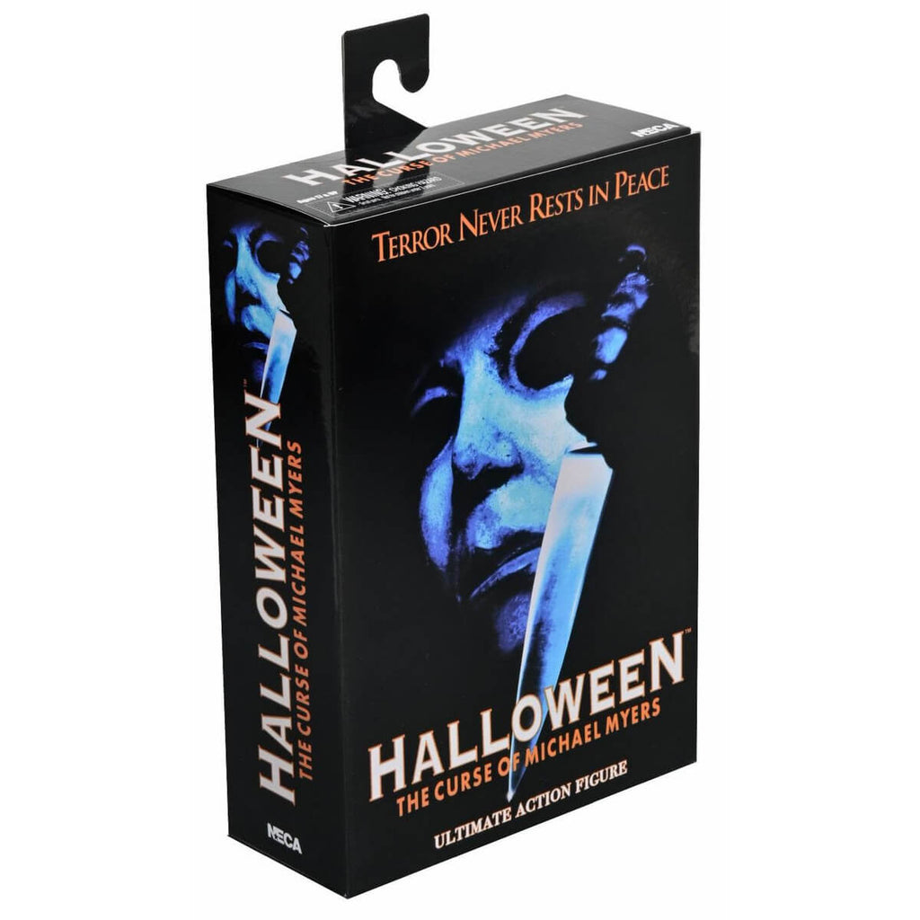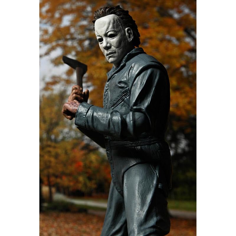 Standing in 7-inch scale, this Ultimate Michael Myers action figure includes interchangeable heads, removed mask, multiple interchangeable hands, axe, machete, crowbar, kitchen knives, bag of runes, sacrificial candles, bundle of syringes, and pumpkin.