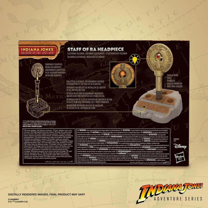Bring the epic quest of Indiana Jones to life with this Staff of Ra light-up headpiece replica. Featuring a removable headpiece with a premium metallic finish, this adventure talisman is expertly crafted to resemble the iconic medallion from the classic Raiders of the Lost Ark film. With realistic detailing, this Indiana Jones collectible is perfect for cosplay or costumes. Adventure awaits! Requires 2 AA batteries, not included.