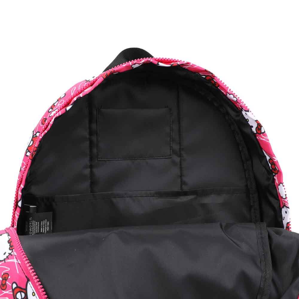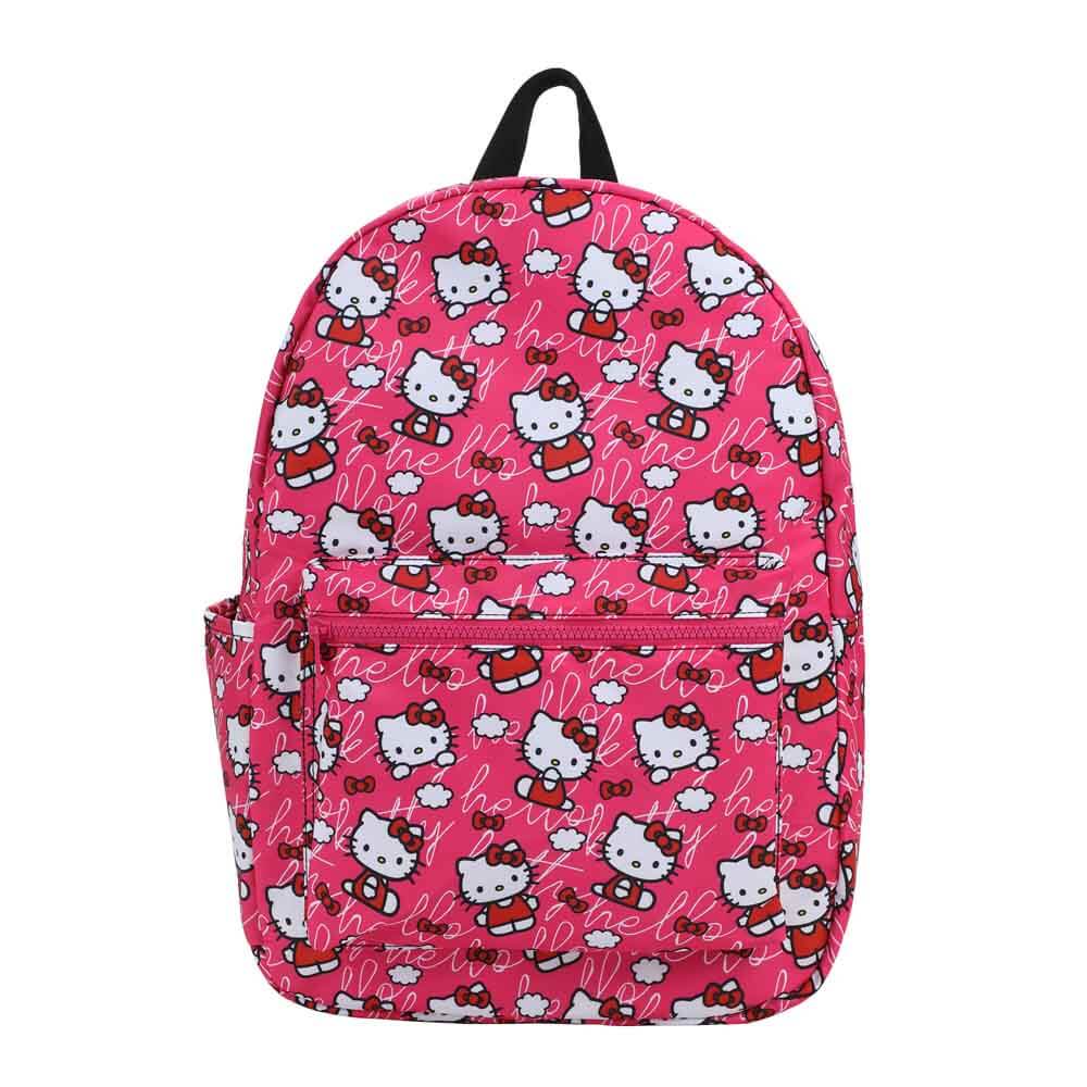 Carry your essentials in style with the Hello Kitty Logo Toss AOP Travel Backpack by Bioworld. It features a front zipper pocket, a padded laptop sleeve inside, and comfy shoulder straps. Stay hydrated with convenient water bottle pockets. Made from durable polyester, it measures 17.5H x 12W x 5.5D inches and is easy to clean with a damp cloth. Perfect for fun adventures!