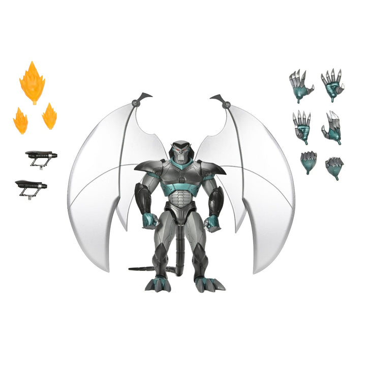 Gargoyles fans rejoice! This 8” tall Steel Clan figure is the perfect tribute to one of the best gothic cartoons of the 90s. It's equipped with gauntlet blasters, attachable thruster blasts, interchangeable hands and bendable tail. Packaging comes with an opening flap so you can display him in style. Bring this beloved character to life and be part of the Gargoyles legend!