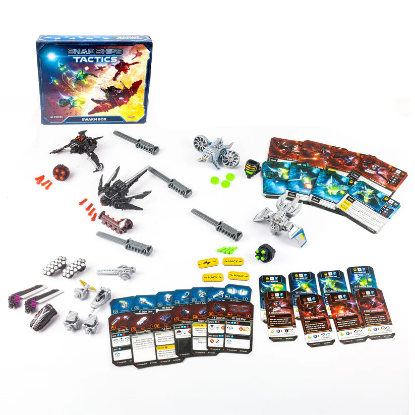 Unleash robotic warfare with the Attack of the Drones expansion! The Forge and The Komplex deploy intelligent drone units, armed with specialized weaponry and coordinated attack patterns, adding a dynamic new layer to your Tactics game. The Swarm Box includes 4 buildable drone units, 10 bonus ship customization pieces, exclusive ship components, 68 game cards, and 4 Hack Tokens.