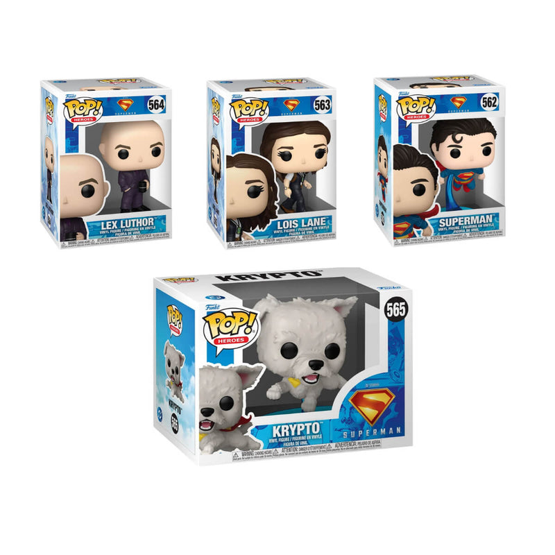 Dive into the world of Superman (2025 Movie) with this Funko Pop! Vinyl Figure set! Each figure stands around 3 3/4 inches tall and is packaged individually in a window display box. Suitable for ages 3 and up, this 4-piece set includes Lois Lane #563, Lex Luthor #564, Superman #562, and Krypto #565—perfect for fans who love a mix of heroes and villains!