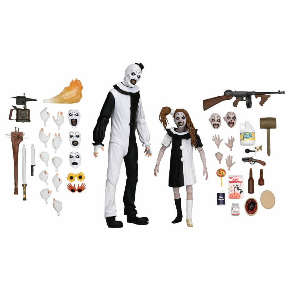 Bring the terror home with NECA's Ultimate 2-pack featuring Art the Clown and The Little Pale Girl from Damien Leone's Terrifier 2. Each figure stands 7 inches tall, dressed in their iconic black-and-white clown attire with multiple interchangeable faceplates and hands for dynamic posing. This horror collector's dream includes an extensive arsenal of exclusive accessories: Tommy gun, flamethrower, sunglasses, heart in a box, cereal box, bicycle horn, lollipop, and more. Whether you're a devoted fan of the cult film series or a serious action figure collector, this dynamic duo captures the twisted essence of the franchise. Packaged in collector-friendly window box display packaging, making it perfect for shelf presentation or as a gift for horror enthusiasts. Secure your set today and complete your Terrifier collection. Ages 17 and up!