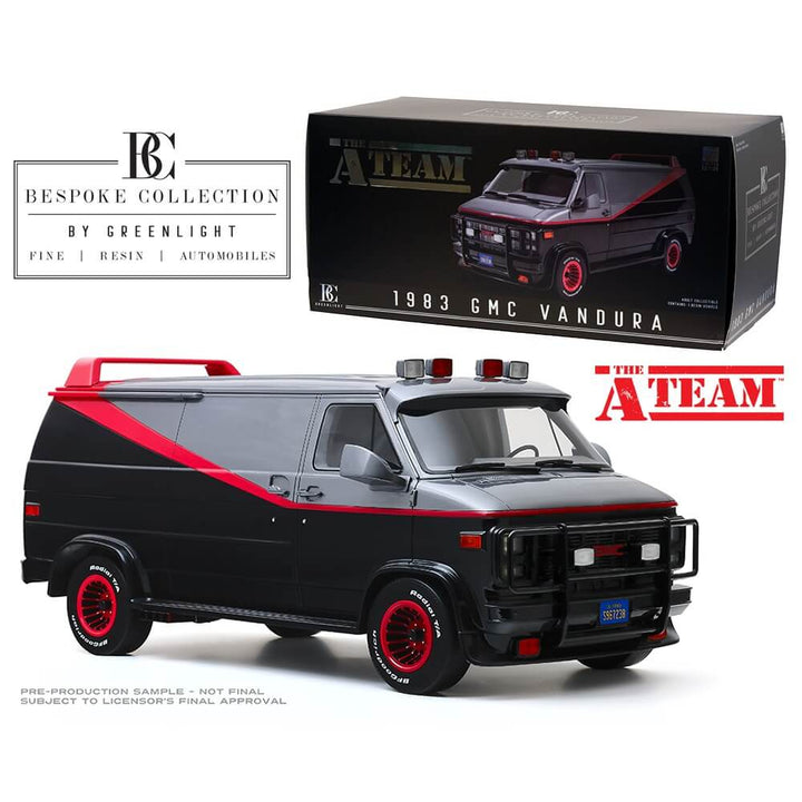 The Greenlight Collectibles A-Team 1983 GMC Vandura Resin 1:12 scale vehicle is a replica of the original. From the Greenlight Collectibles Bespoke Collection, it measures over 14 inches and is fully painted with exquisite detail. Join Murdock, B.A., Hannibal, and Faceman on their next adventure in the 1983 GMC Vandura. Grab yours while they are still around!