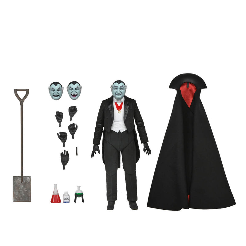 Dressed in his signature outfit, Grandpa is fully articulated and ready to cook up some kooky experiments. This collectible figure includes multiple interchangeable heads featuring the likeness of actor Al Lewis, as well as interchangeable hands, soft goods cape, several potions, and a shovel.